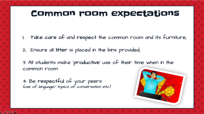 Students may use the common room during breaks and lunchtimes and for half an hour before and after school. They are expected to show consideration to others in the way they look after and use the common room.