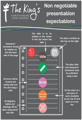 At The King’s, we recognise the visual appearance of work is important. Well-presented work evokes a positive response in the reader and promotes a sense of pride in the student’s own work. Students being able to express themselves in a fluent, extended and accurate way is one of the most important tools to succeed. A culture of well-presented work will foster an understanding of the importance in the world of work of accuracy and high quality presentation. In addition, exercise books, more than ever before, are the primary source of revision for students. They must be clearly laid out in order to be useful.