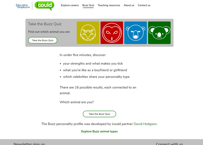 https://icould.com/buzz-quiz/ - Take the iBuzz personality quiz and identify your strengths, match your characteristics and strengths to potential future career pathways and find out which animal you are most associated with.