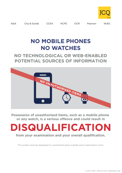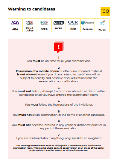In this section you will find the JCQ exam rules and regulations to help ensure that your child knows how to conduct themselves in an examination. It is imperative that your child is familiar with these rules and understands the full ramifications should they be broken.